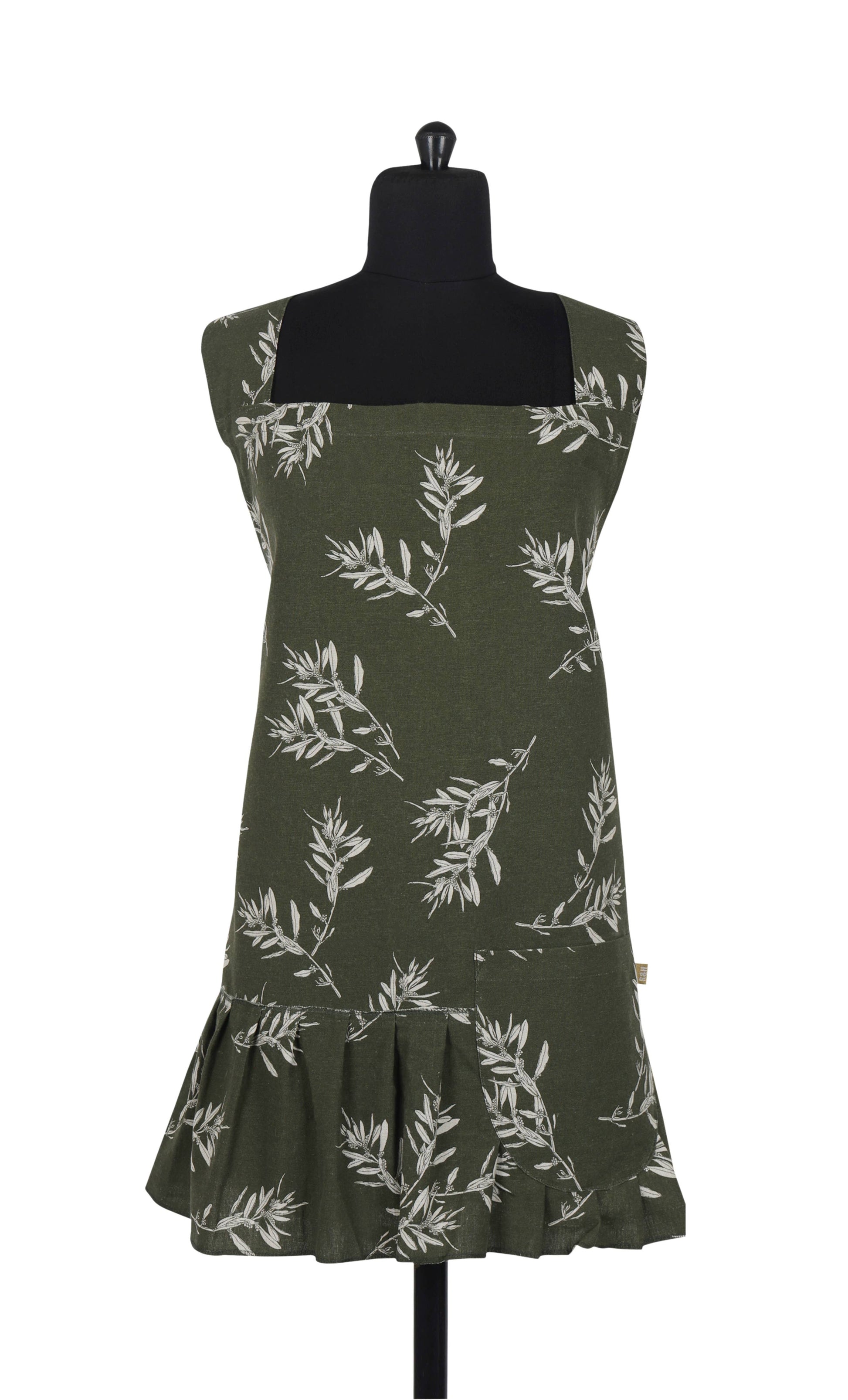 Embrace eco-friendly fashion in the kitchen with this ruffled pinafore apron crafted from 100% recycled cotton. Look good and feel good knowing you're doing your part for the planet. The charming Olive branch print in green adds a touch of whimsy to your kitchen attire. Perfect for home chefs and garden enthusiasts alike! One deep pocket keeps your essentials handy, while this flattering and flirty pinafore style offers comfortable coverage. The cleverly design fits most sizes. Simply slip this apron on over your head, no need to fuss with ties. Package in a recyclable cardboard canister for easy display and gift giving.