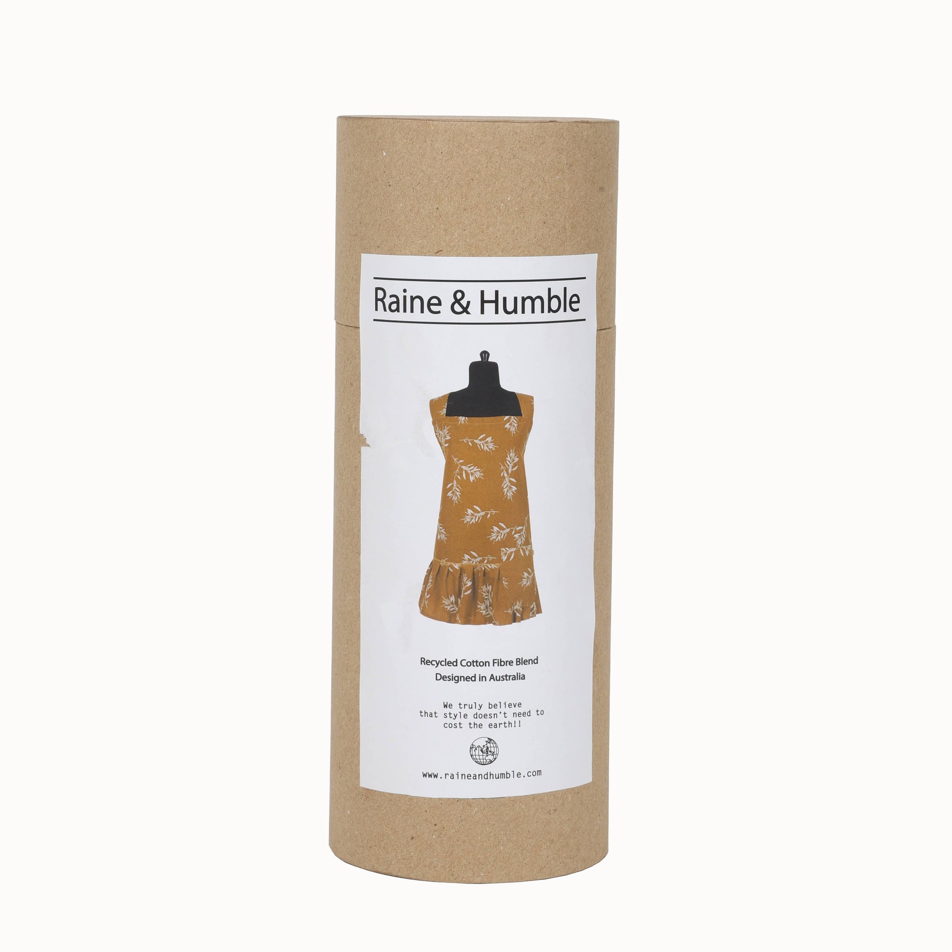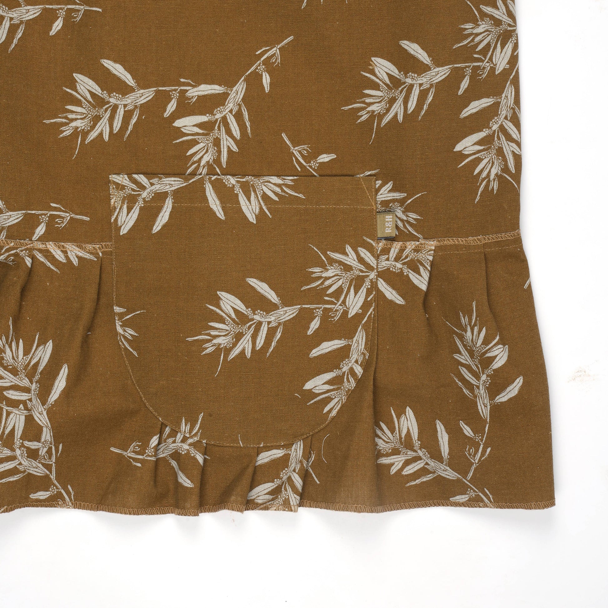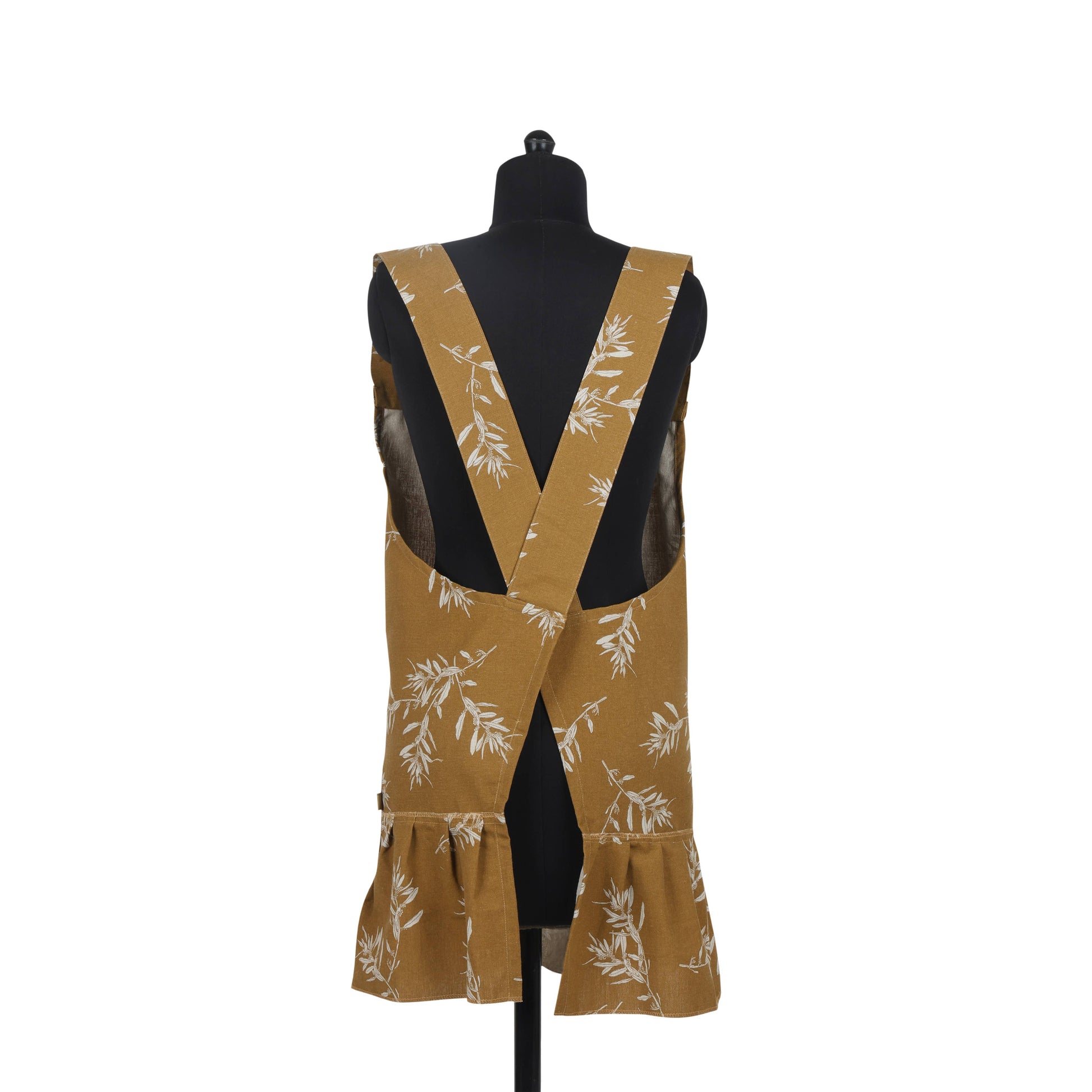 Embrace eco-friendly fashion in the kitchen with this ruffled pinafore apron crafted from 100% recycled cotton. Look good and feel good knowing you're doing your part for the planet. The charming Mustard Olive branch print in green adds a touch of whimsy to your kitchen attire. Perfect for home chefs and garden enthusiasts alike! One pocket keeps your essentials handy, while this flattering and flirty pinafore style offers comfortable coverage. The clever design fits most sizes. Simply slip this apron on over your head, no need to fuss with ties. Package in a recyclable cardboard canister for easy display and gift giving.