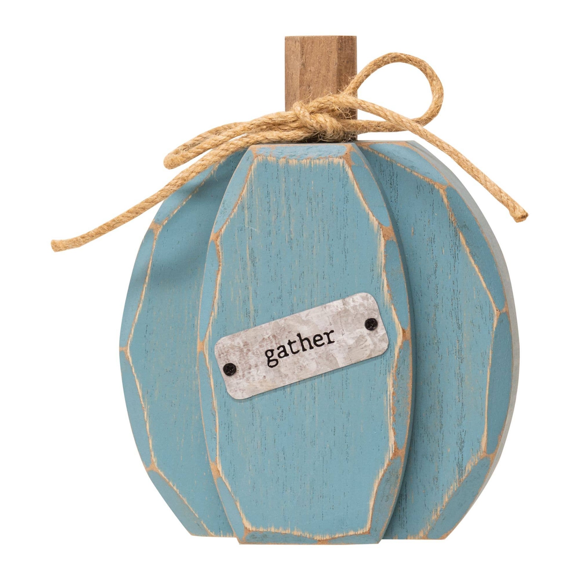 Chunky Blue Harvest Pumpkin will add a mix of textures and a lovely blue shade to farmhouse décor this Fall. This farmhouse blue pumpkin is made of solid wood and distressed edges. The pumpkin has a wooden stem with a jute bow and the center of the pumpkin bears a metal plate that reads ‘harvest.’ The color of this pumpkin makes a lovely complement to Fall-time florals. This piece is wonderful for adding a little depth to displays that need more than a flat sitter but less than a full pumpkin. Measures 6" high by 4.75" wide by 1.5" deep.