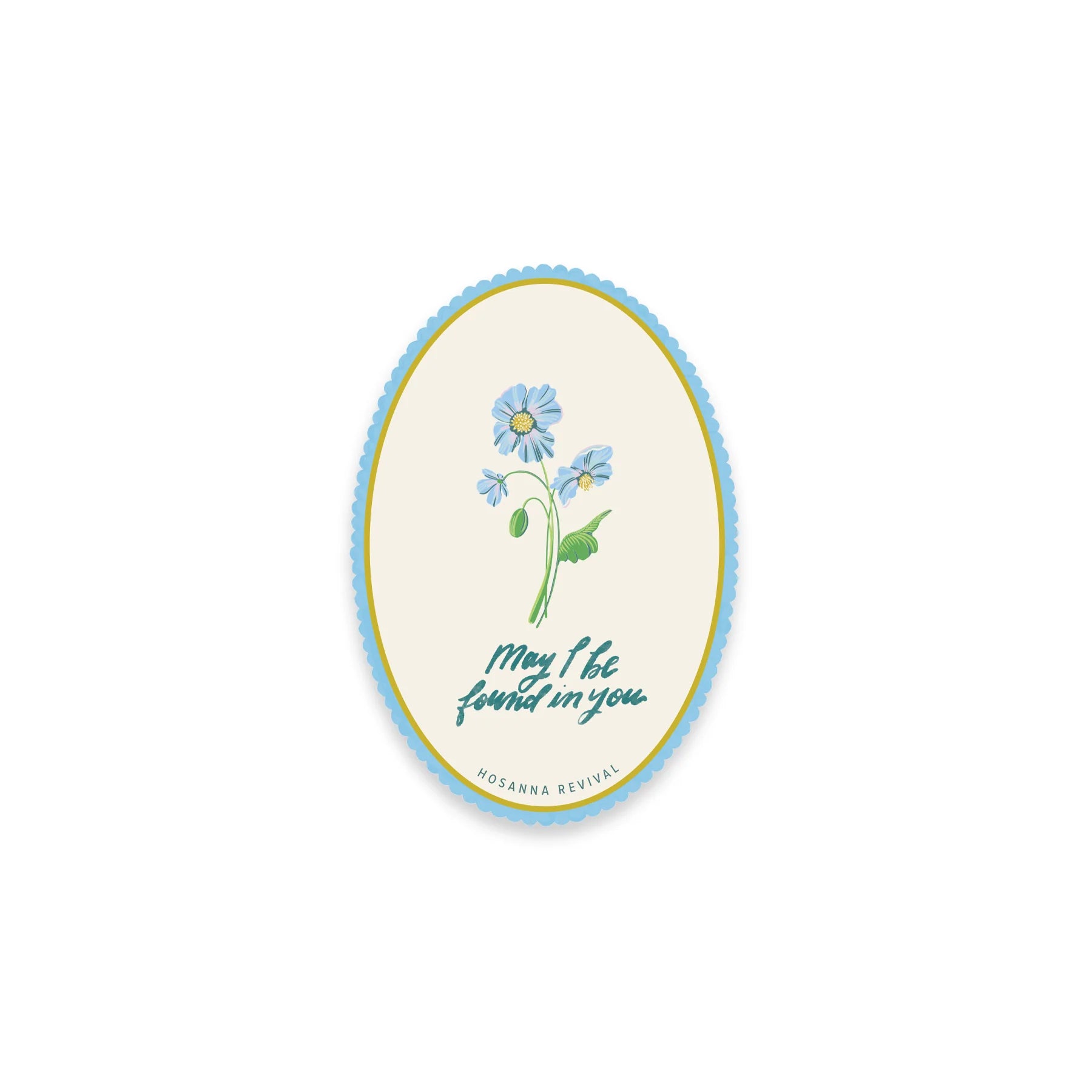 This beautiful oval sticker features a blue cosmo flower with the hand-lettered phrase, “May I be found in you,” serving as a beautiful reminder of God’s faithful commitment to us.