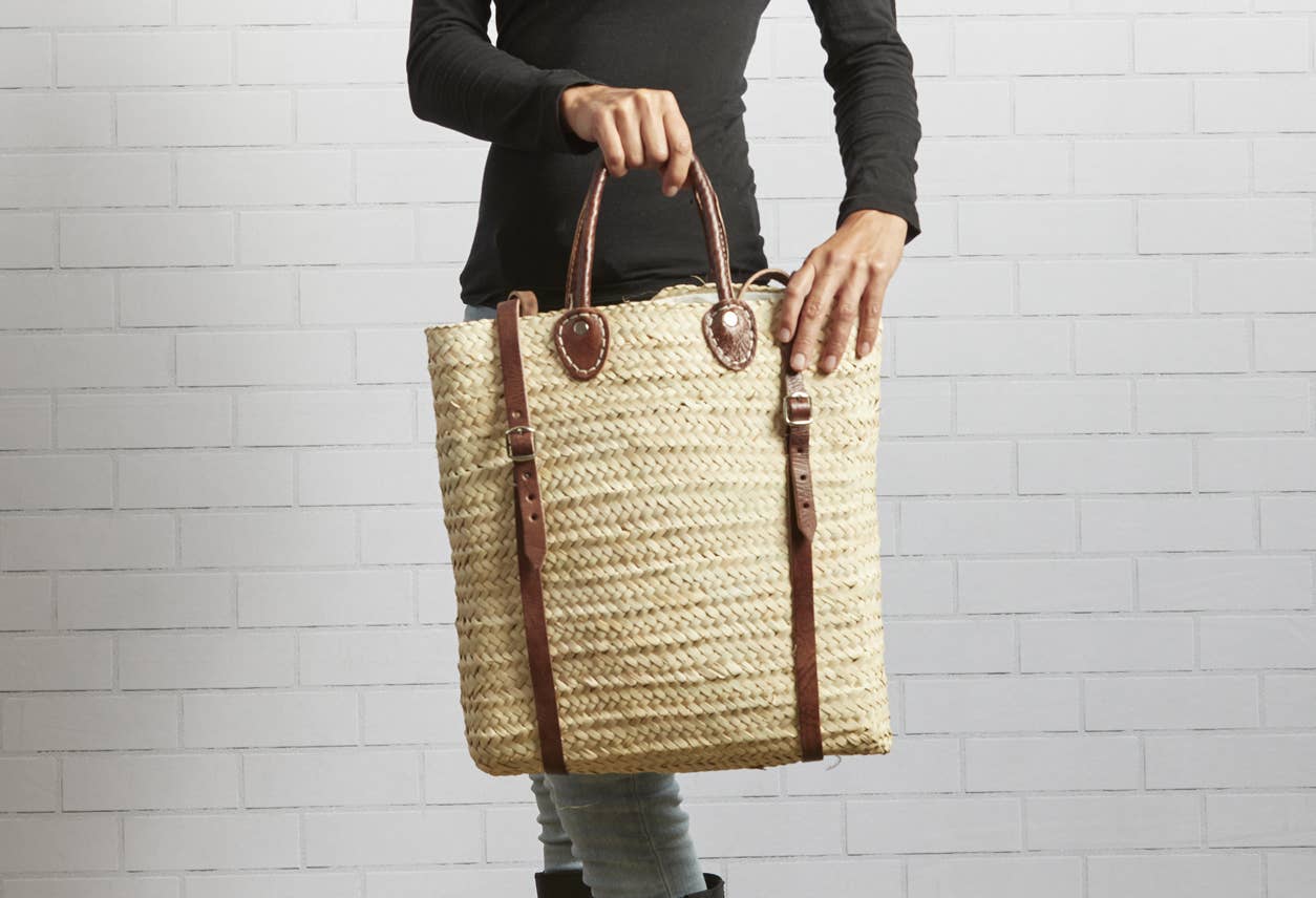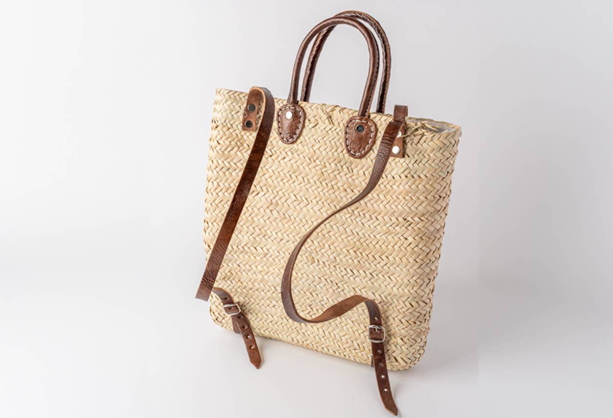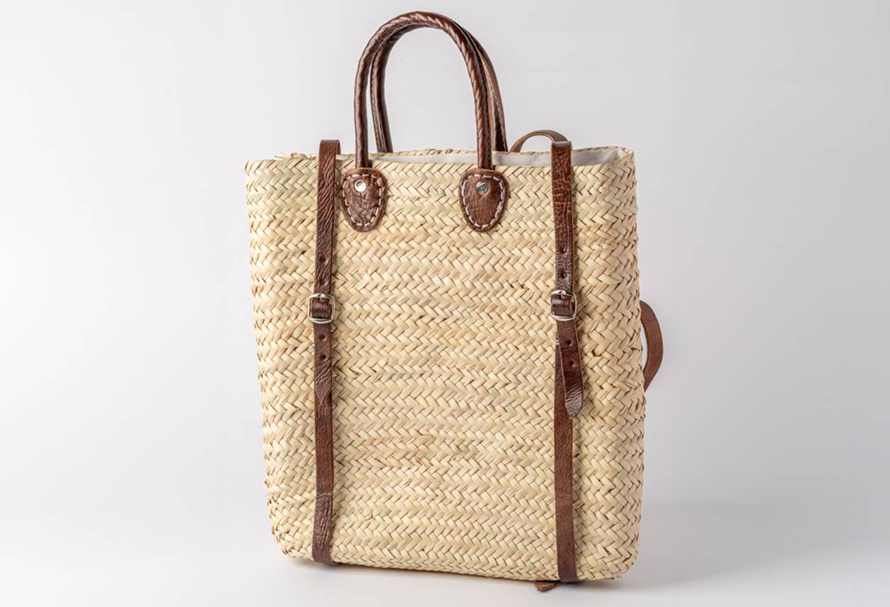 Moroccan basket-making regions are identifiable by the material used to form the body of the bag. These backpacks are made with Dwarf Palm from an area north of Fez that gives a special balance between great strength and softness. Artisans near the Atlas Mountains (where the Dwarf Palm is indigenous) weave the fine palm, and leather workers in Marrakesh finish the straps and handle.