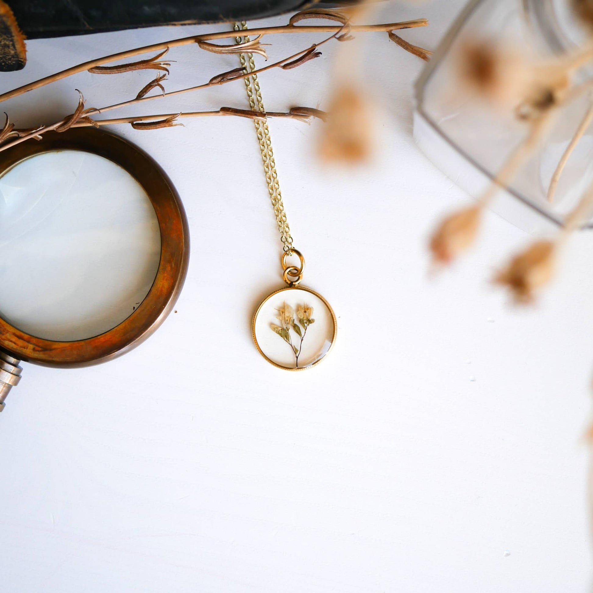 Tiny Dried Bouquet Pendant: 26" gold plain chain