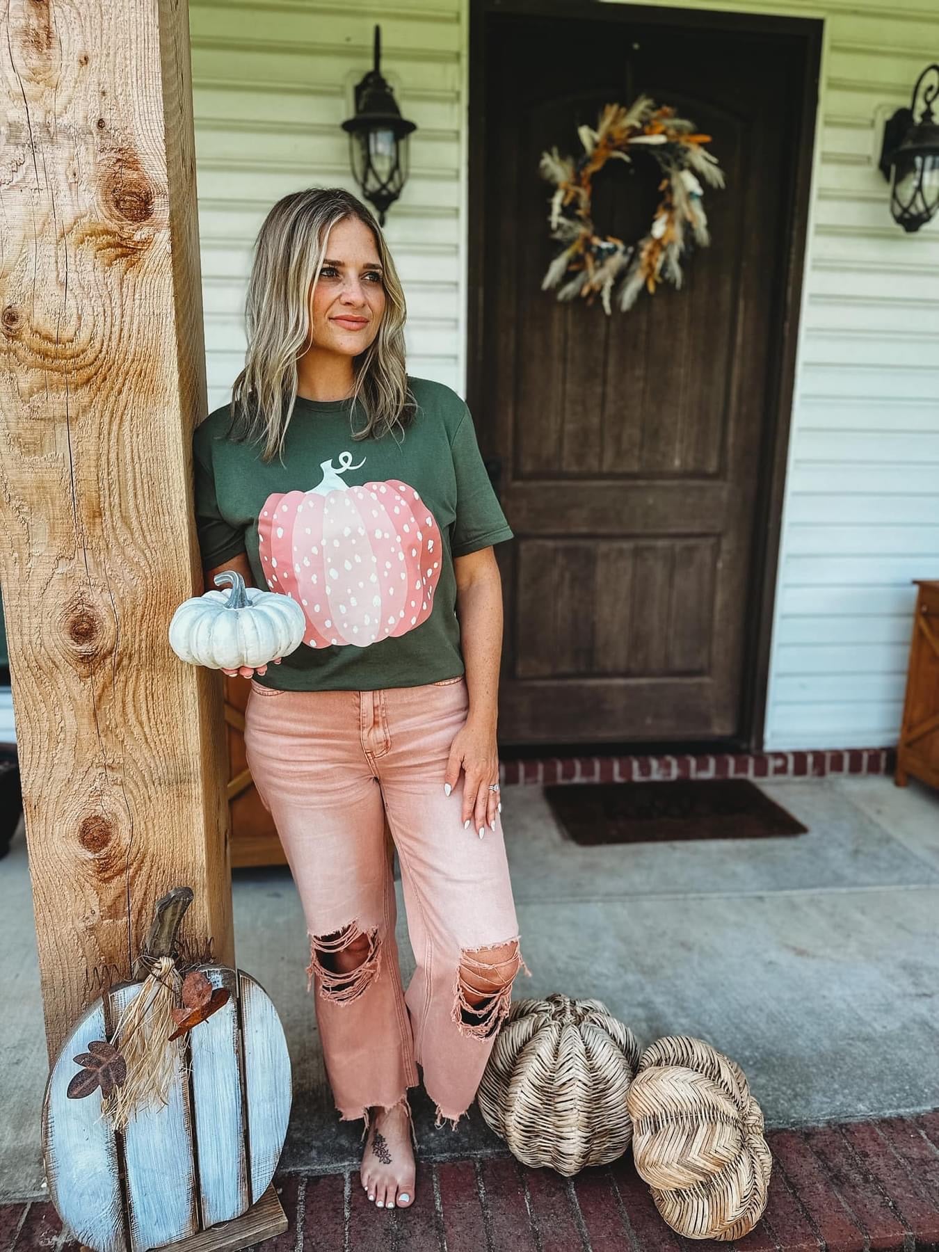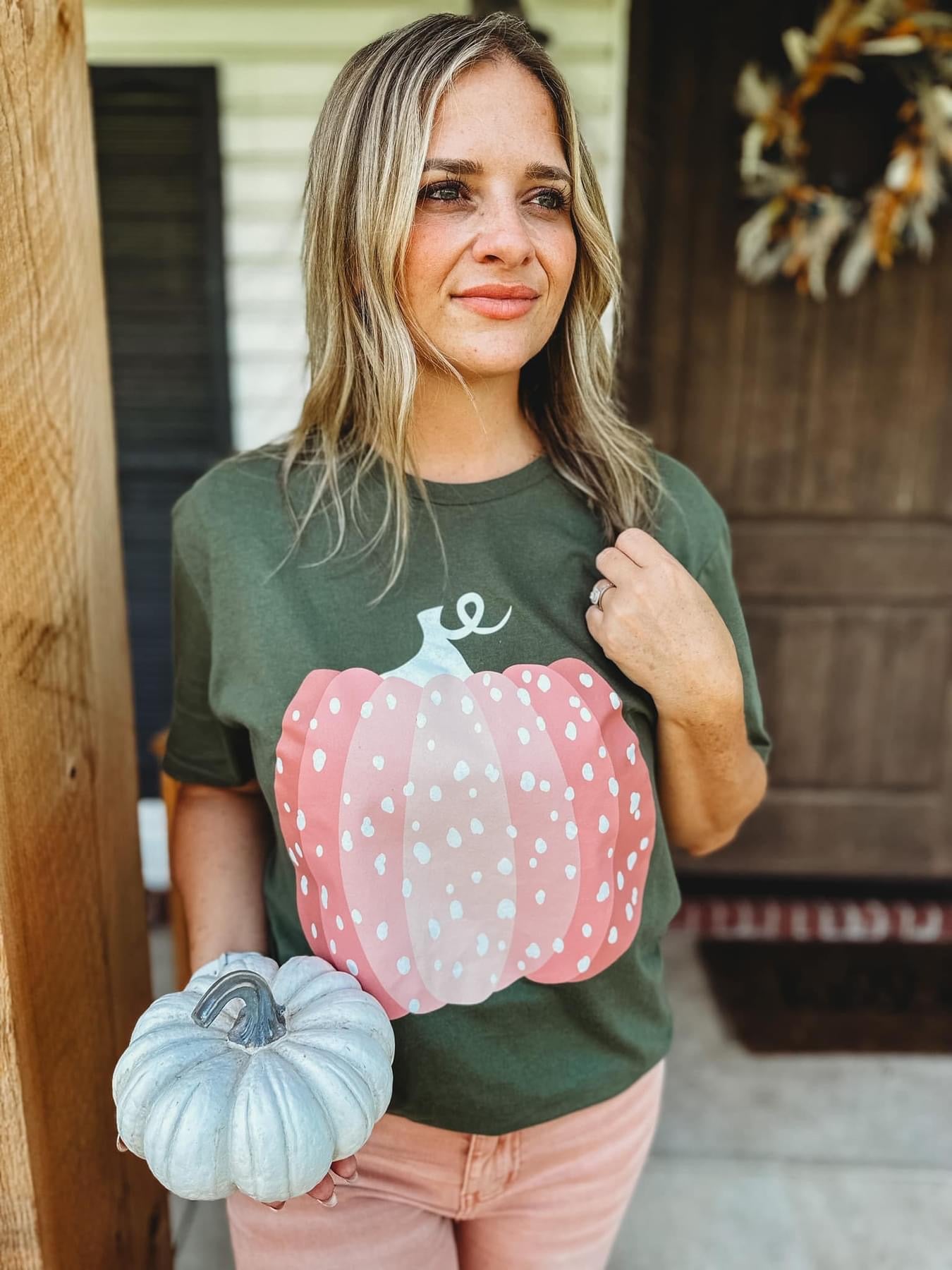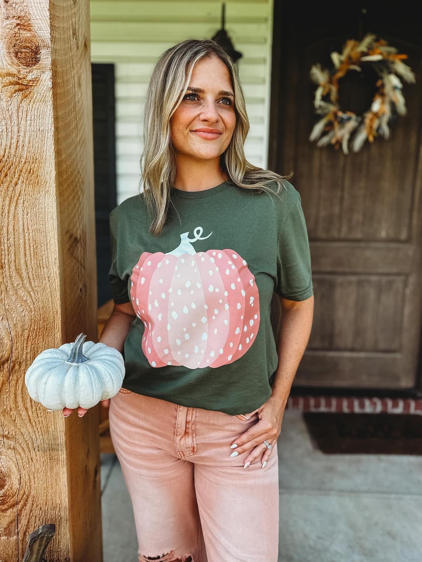 Feel the gourd vibes in our blush pumpkin graphic tee! This colorful graphic is as sweet and cozy as a pumpkin spice latte, and its boho vibes are sure to make you the trendiest squash in the patch. Get the ultimate fall look with this super-sweet tee! * military green tee