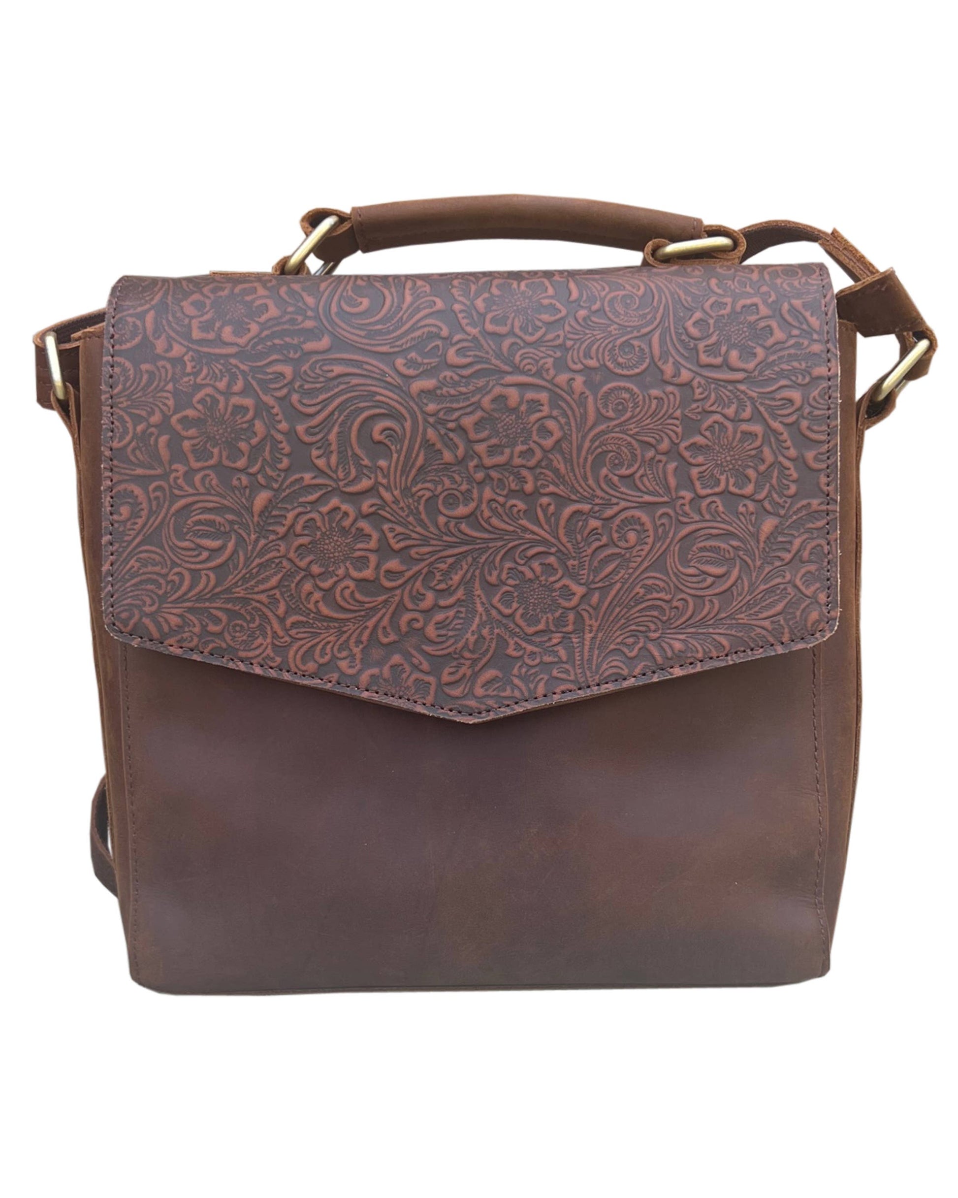 The spacious main compartment has a full leather over flap with a magnetic snap closure, along with an interior zipper pocket.