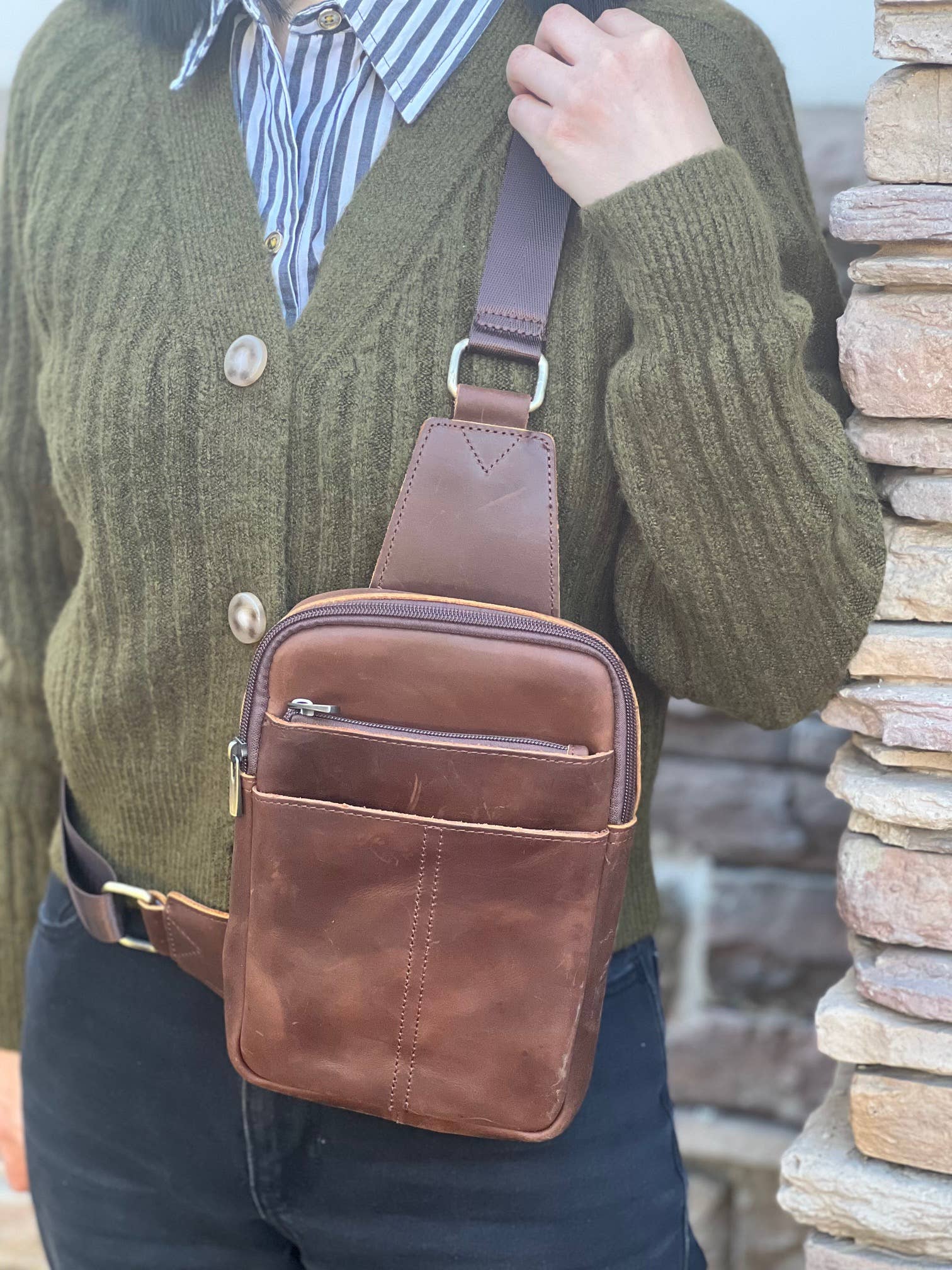 Crazy horse Leather Crossbody /Sling Chest Bag Travel Bag in Brown and light brown